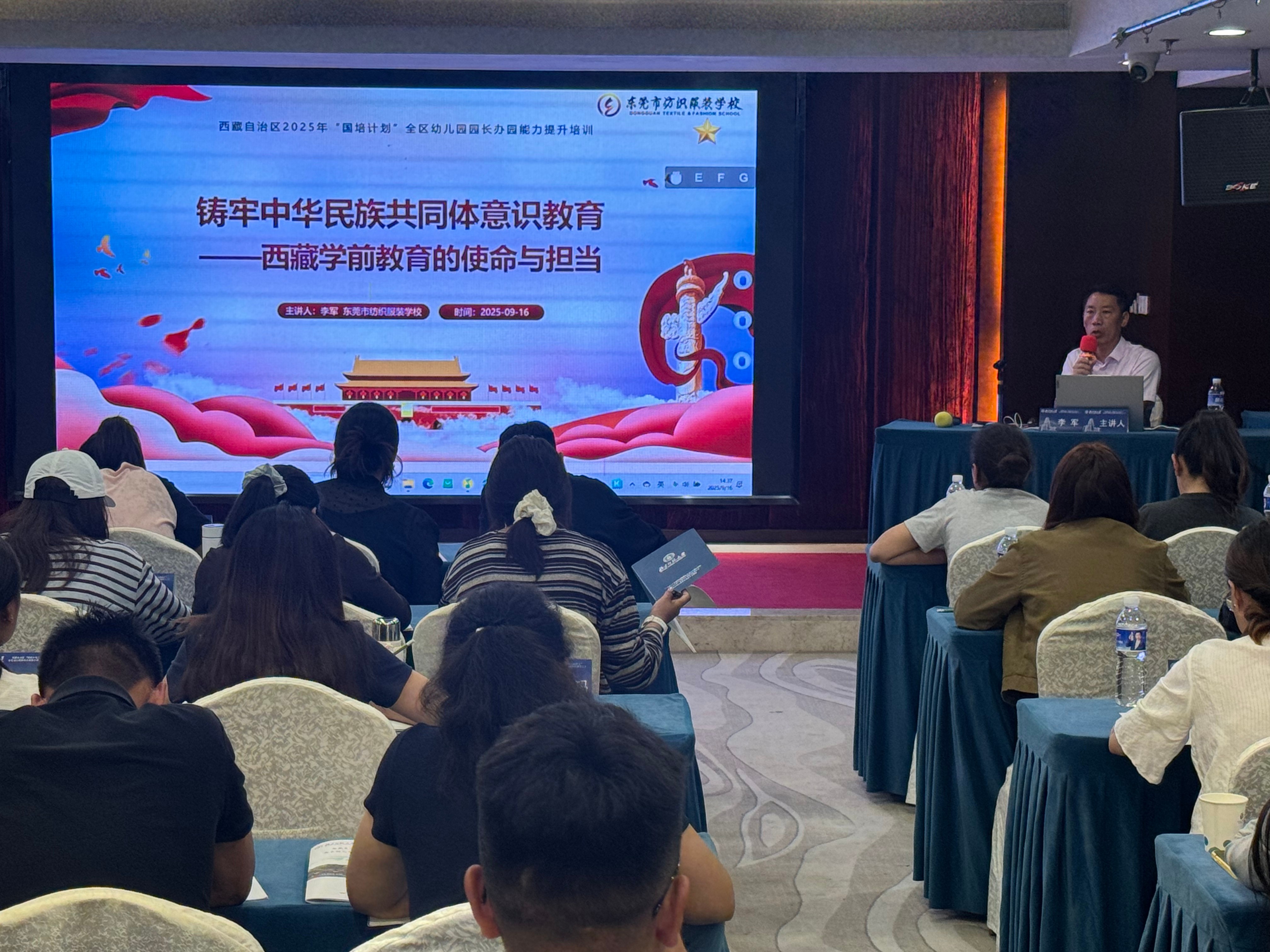 下午,东莞市纺织服装学校李军老师作了题为《铸牢中华民族共同体意识教育——西藏学前教育的使命与担当》的专题讲座。李老师从中华民族共同体的历史脉络、文化内涵和教育实践等方面,系统阐述了在学前教育阶段加强民族团结教育的重要性与实施路径。他强调,西藏学前教育工作者应积极将中华民族共同体意识融入日常保教活动,通过环境创设、课程实施和文化活动等多种方式,引导幼儿从小树立正确的国家观、民族观、文化观,为培养担当民族复兴大任的时代新人奠定坚实基础。