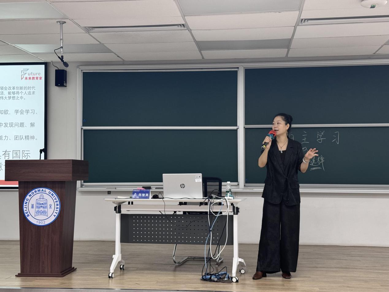 开班仪式结束后,北京师范大学未来教育学院PBL教研中心主任年智英老师参训教师带来了题为《全球胜任力视域下的PBL理论发展》的专题讲座。讲座从全球胜任力培养的时代需求切入,深入解析了项目式学习(PBL)的核心内涵,系统讲解其关键要素与实施路径。年教授通过与传统小组学习的对比,强调PBL能够让学生的思维过程更加可视化,突破“最近发展区”,有效促进学生批判性思维、创新能力和问题解决能力的形成与发展。
