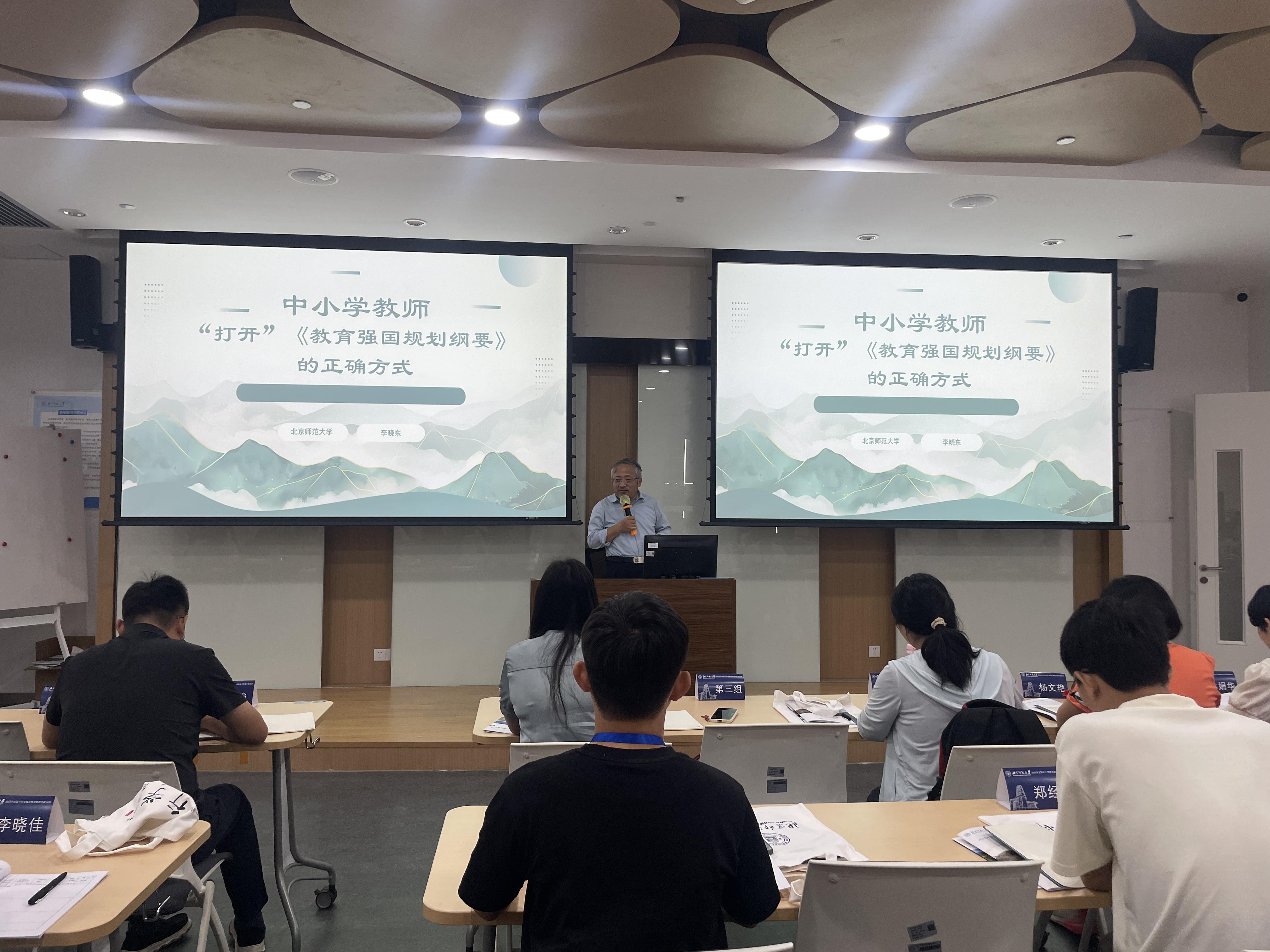 肇庆高新区教师发展中心副主任彭常发强调“纪律是研修质量的底线”,希望学员们以严谨的作风投入学习,珍惜难得的研修机会,真正做到心无旁骛、学有所悟、研有所得。开班仪式后,北京师范大学李晓东教授带来主题讲座《“打开”〈教育强国规划纲要〉的正确方式》,拉开本次学习的序幕。
