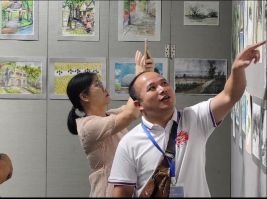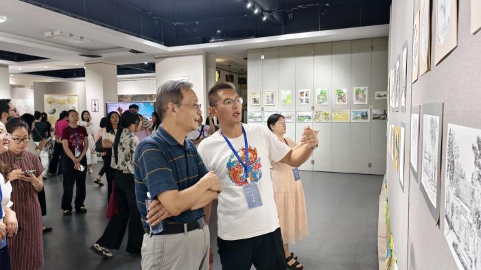 这方展墙,既是培训成果的检阅台,更是美育创新的孵化器。你看,老师们驻足画前,指尖划过笔触的细节,眼神交换着对构图的思考——那些低声的探讨,正悄然孕育着下一堂课的灵感。
